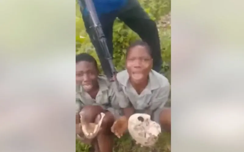 The footage shows the two young Seminarians with what appears to be a human skull crying and pleading for their release while surrounded by gun-wielding individuals believed to be their captors.