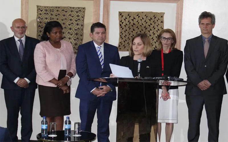 US government Head of Delegation Valerie Huber (on mic) reads the joint statement by ten countries flanked by various government representatives who are party to the statement.