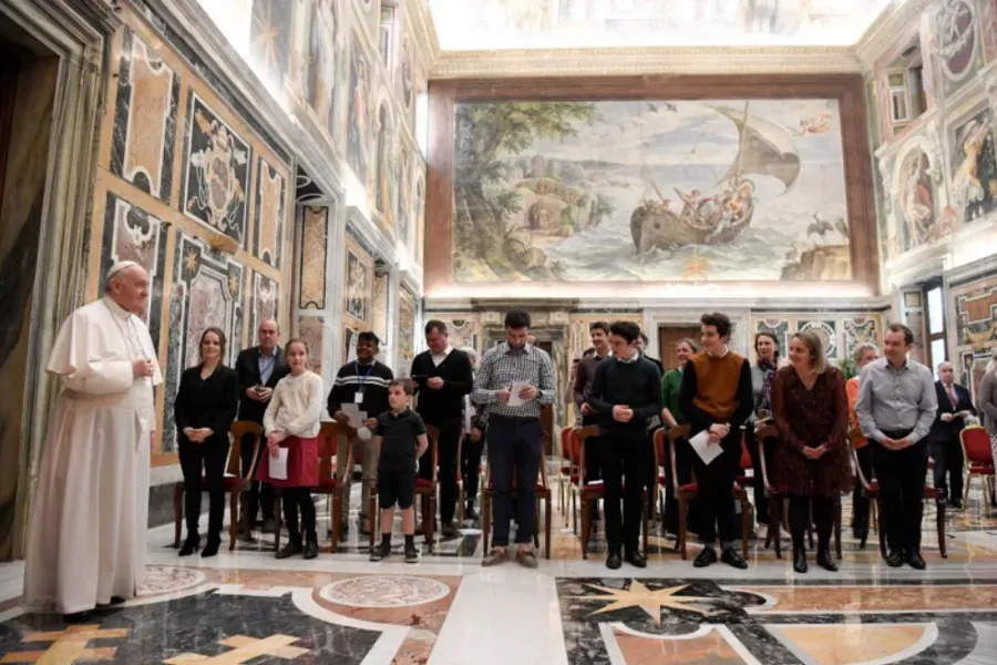 The pope met the group in the Clementine Hall of the Apostolic Palace – a room with walls completely covered with Renaissance frescoes.