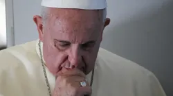 Pope Francis prays with journalists on a papal flight August 14, 2014. Alan Holdren/CNA