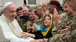 Pope Francis greets a group of Ukrainian soldiers at the end of his weekly general audience on 23 May  2018 in St. Peter's Square at the Vatican. Credit: Aleteia