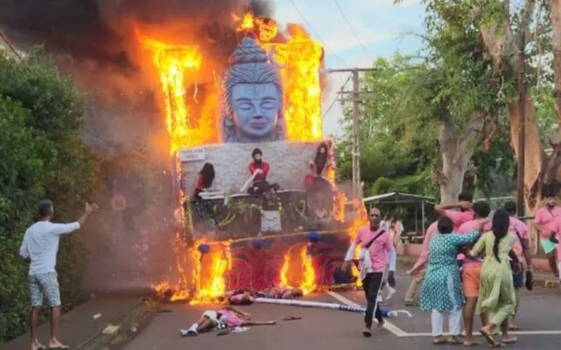 At least six people died and 17 others were injured when the kanvar (statue) hit high voltage power lines in Triolet, Arsenal. Credit: Le Mauricien