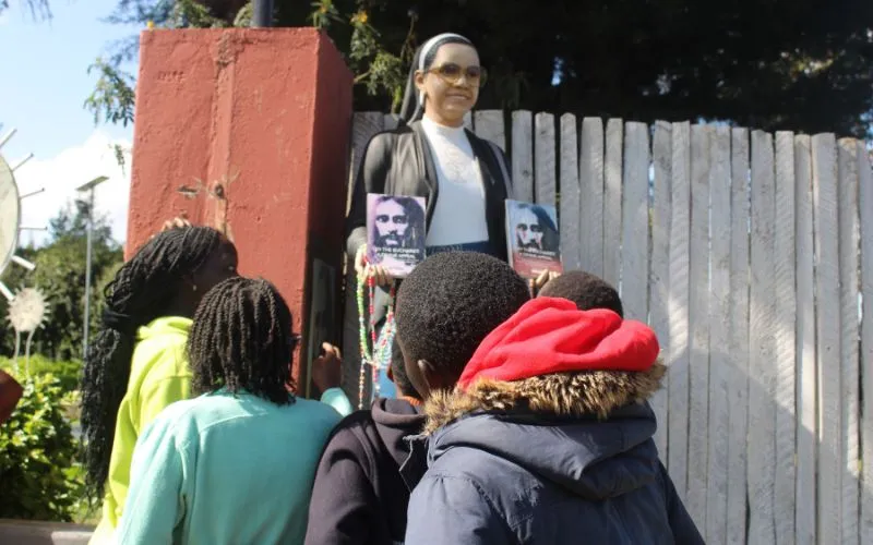 Children gather around the statue of Sr. Anna Ali of the Most Holy Eucharist at the Eucharistic Center in the Catholic Diocese of Eldoret. Credit: ACI Africa