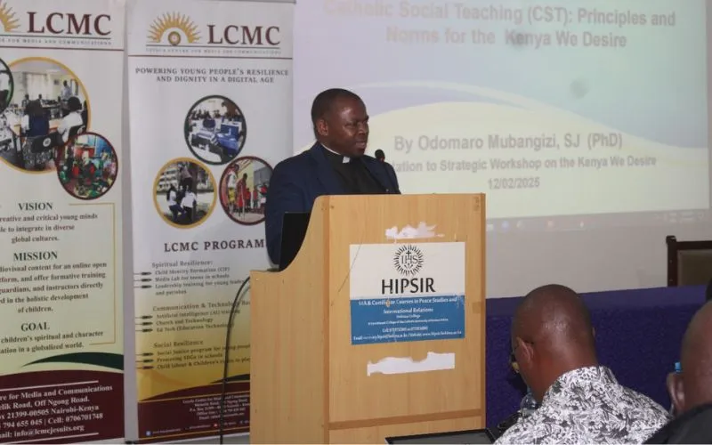 Fr. Odomaro Mubangizi presenting during the Febraury 10-12 strategic workshop at the Hekima Institute of Peace Studies and International Relations (HIPSIR) at Hekima University College. Credit: ACI Africa