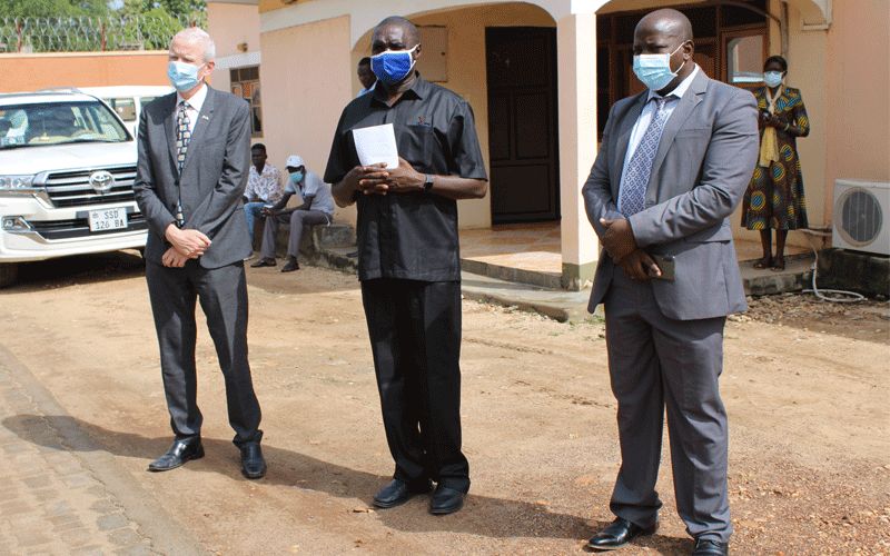 Fr. James Oyet Latansio (Center), UK ambassador Christopher Trott (left) and Christian Aid Country Director (right) after the launch a helpline center for psychosocial and trauma healing of the people affected by COVID-19 in South Sudan.