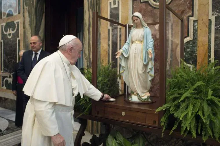 Pope Francis blesses a statue of the Immaculate Virgin Mary of the Miraculous Medal Nov. 11, 2020. Credit: Vatican Media.
