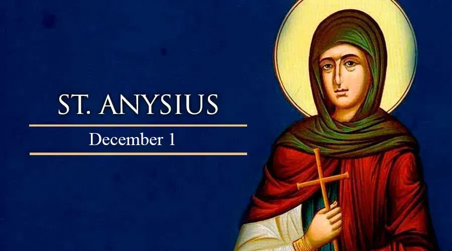 Saint Anysius was a Martyr of Greece. She was a wealthy woman of Salonika, in Thessaly, who used her personal funds to aid the poor. A soldier accosted her in the street and tried to drag her to a pagan sacrifice. Anysius resisted and was killed when the soldier attacked her with his sword.
