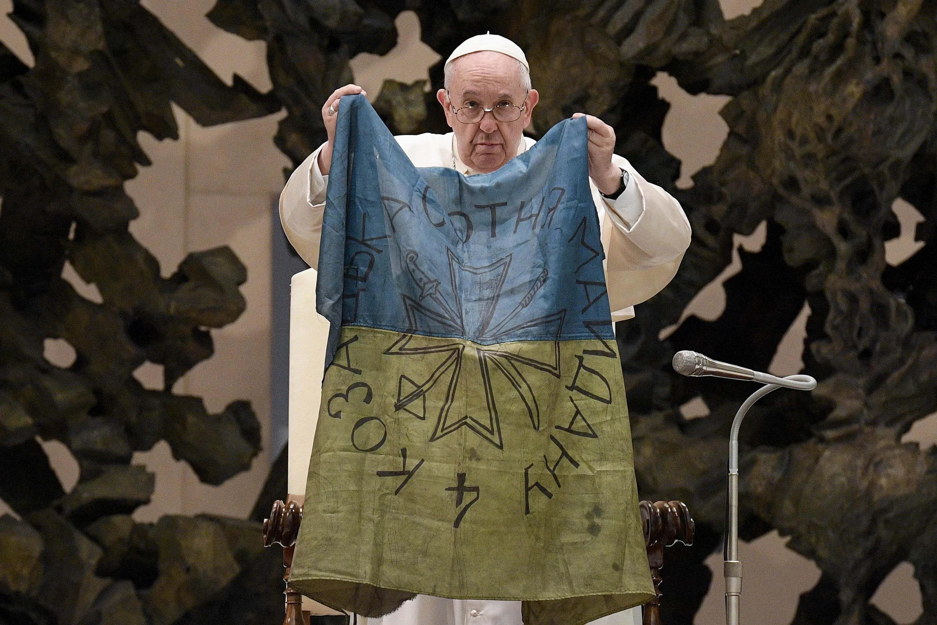 The pope held up a blue and yellow flag which he said was brought to him from “the martyred city” of Bucha, Ukraine at the end of his general audience on Wednesday morning.