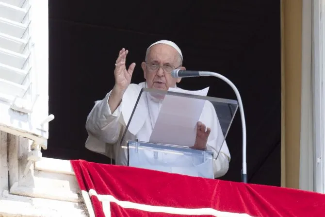 Pope Francis speaks to the crowd assembled in St. Peter's Square on Aug. 15, 2023, for the recitation of the Angelus on the solemnity of the Assumption of the Blessed Virgin Mary. | Vatican Media