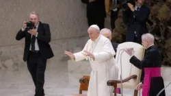 Pilgrims at the Wednesday general audience Aug. 9, 2023, hold up an image of the Virgin Mary. / Credit: Daniel Ibañez/CNA