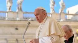 Pope Francis speaks at the general audience in St. Peter's Square on May 4, 2022. Daniel Ibanez/CNA