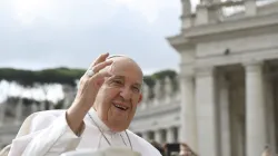 Pope Francis waves to pilgrims gathered in St. Peter’s Square for his Wednesday general audience on May 22, 2024, at the Vatican. / Credit: Vatican Media